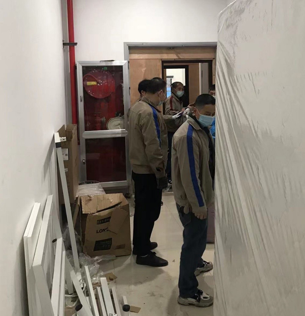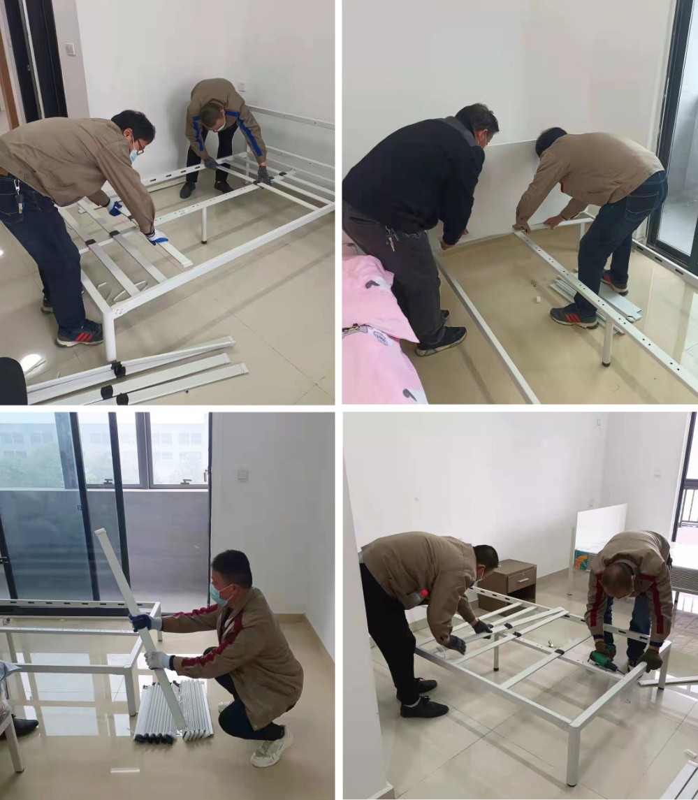 9點多,志愿者們到達第一個增援點,立即投入“戰(zhàn)斗”,先安裝兩個樓層的床位,之后立馬又調(diào)至第二個增援點,那里有十二個樓層,每層29個房間,志愿者們自己搬運床架組件,自己組裝,跑上跑下,爭分奪秒,為的是趕在隔離點人員到來之前全部安裝完畢。大家一刻不停,與時間賽跑,使勁趕進度。期間還安裝房間鋼架椅子,清理房間里的垃圾。
