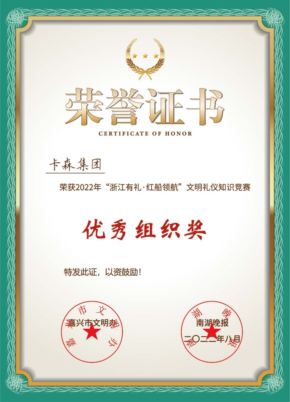 日前,“浙江有禮·紅船領航”文明禮儀知識競賽落下帷幕,海寧市獲得了總戰(zhàn)報參與率第一的好成績!我們卡森集團榮獲優(yōu)秀組織獎,中共黨員徐春江、陳雪江榮獲優(yōu)秀積極分子。