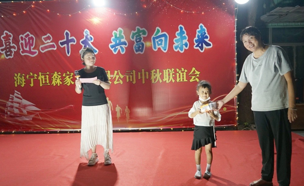 9月7日晚,一場(chǎng)別開(kāi)生面的“喜迎二十大·共富向未來(lái)——海寧恒森家具有限公司中秋聯(lián)誼會(huì)”在路仲?gòu)S區(qū)的場(chǎng)地上完美呈現(xiàn)。沒(méi)有璀璨的燈光,沒(méi)有高檔的音響,亦沒(méi)有華麗的服裝和專業(yè)的演出技能,公司近200名員工簡(jiǎn)樸地歡聚在一起,用歌舞表演等形式迎接壬寅中秋和二十大的到來(lái);用圓桌圓盤(pán)等寓意中秋團(tuán)圓,十全十美。