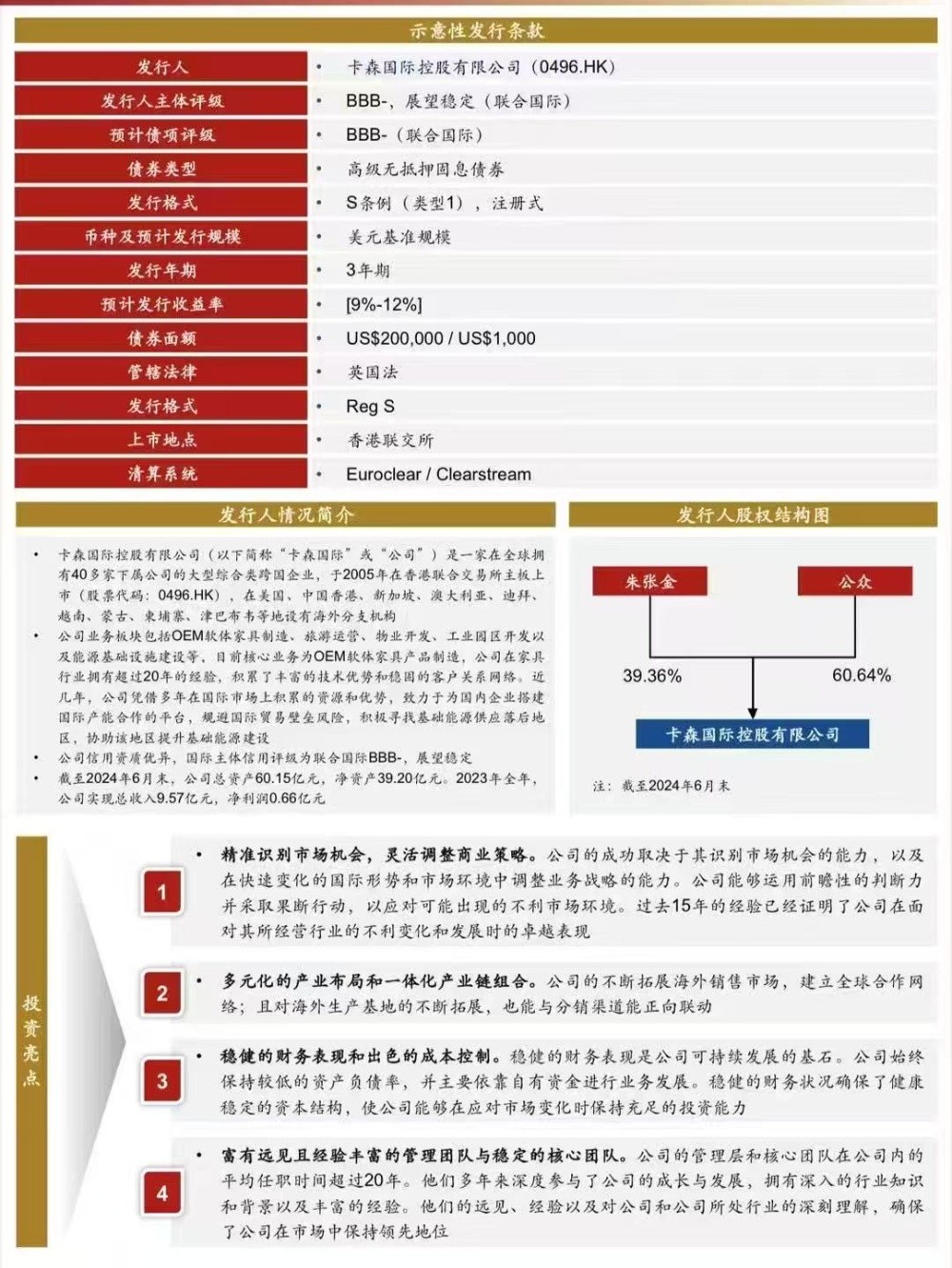 卡森國(guó)際(00496.HK)在港股上市二十余年,公司資產(chǎn)質(zhì)量良好,運(yùn)營(yíng)穩(wěn)健,負(fù)債率低,存量資產(chǎn)優(yōu)質(zhì),目前正在進(jìn)行的投資項(xiàng)目(柬埔寨浙江經(jīng)濟(jì)特區(qū)項(xiàng)目、蒙古國(guó)火電項(xiàng)目、津巴布韋火電項(xiàng)目),未來三至五年回報(bào)較高,且償債能力強(qiáng)!作為近年來為數(shù)不多的發(fā)改委批復(fù)額度的非地產(chǎn)民企高收益美元債,具體收益率及發(fā)行條件可談!歡迎感興趣的朋友和袁志剛聯(lián)系!